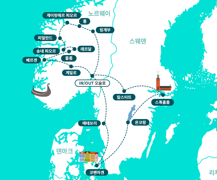 ※ 항공 출도착 시간 및 편명은 미정이며 확정 후 홈페이지, 이메일, 문자 등을 통해 알려 드리겠습니다. √ 한진관광 북유럽 상품의 특별함① 대한민국 최초&최다 노르웨이 직항 전세기 운영 경험② 전세기 노하우를 바탕으로 한 알찬 상품 구성③ 경험 많은 북유럽 전문투어리더가 동행√ 프리미엄 국적기 대한항공 직항편 인천-오슬로 왕복 탑승[스카이패스 약 7,600마일 적립]※ 전세기 항공편의 경우 대한항공 마일리지를 통한 좌석 승급 및 구매는 불가합니다.√ 전일정 엄선한 3~4성(★★★~★★★★) 호텔 숙박① 북유럽 대표 체인호텔 SCANDIC, FIRST HOTEL, THON 등의 체인 호텔 숙박 포함② 노르웨이 피오르 및 산악 지역 전통 호텔 숙박 √ 북유럽의 대표 특식 및 전통식 제공 ① 북유럽 호텔에서 즐기는 '바이킹 뷔페식'② 북유럽 전통식사 및 호텔식/중국식/한식/현지식 등 포함※ 현지 사정에 따라 메뉴는 변경 될 수 있습니다.√ 북유럽 여행 핵심 포함 관광지 ■ 노르웨이 ■ ① 노르웨이의 수도, 노벨평화상이 수상되는 평화의 도시 '오슬로' : 비겔란 조각공원, 프람호 박물관(내부)② 한자동맹의 중심이자 세계문화유산으로 등재된 도시 '베르겐' : 브리겐 거리③ 노르웨이에서 가장 높은 산자락에 있는 아름다운 국립공원 마을 '롬' : 스타브교회(외관), 보브라강과 프레스트 폭포 감상④ 아름다운 계곡마을 '플롬' : 로맨틱 열차 플롬라인 탑승⑤ 204km의 길이로 세계에서 두 번째로 긴 '송네 피오르' : 카페리 탑승하여 송네피오르 도하⑥ 바이킹 시대부터 정착된 마을 '피얼란드' : 노르스크 빙하 박물관(내부), 뵈이야 빙하 조망⑦ 유네스코 세계 자연 유산이자 아름다움을 자랑하는 '게이랑에르 피오르' : 게이랑에르 피오르 유람선 탑승■ 스웨덴, 덴마크 ■ ① 아름다운 운하의 도시 스웨덴의 수도 '스톡홀름' : 바사호 박물관(내부) 등② 덴마크 북부의 아름다운 도시 '힐레뢰드' : 프레데릭스보르 성(외관)&캐슬 정원③ 휘게의 나라 덴마크의 수도 '코펜하겐' : 아말리엔보그 궁전(외관), 시청사, 인어공주 동상 등√ 국가별 한국인 가이드 진행 및 북유럽 전문투어리더 동행 - 자연 경관 관광 위주로 이루어진 노르웨이 지방 구간의 경우 북유럽 전문투어리더가 가이드 역할을 수행합니다.√ 전 일정 45~50인승 차량 탑승- 출발인원 관계 없이 전 일정 대형 차량 탑승√ 전 일정 수신기 대여