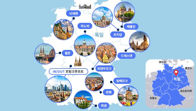 [주요 관광지 & 독일 9대 도시]■ 로만틱가도의 종점 퓌센■ 바이에른 왕국의 수도이자 맥주와 축구의 도시 뮌헨 ■ 중세의 모습이 그대로 남아 있는 로텐부르크■ 포스담 회담으로 유명한 역사적인 도시 포츠담■ 독일의 베니스라 불리는 운하의 도시 밤베르크■ 작센주의 주도이자 바로크 예술의 도시 드레스덴 & 드레스덴 야경 관광 ■ 독일의 수도이자 아픔의 역사가 살아 있는 곳 베를린■ 라인강 유역에 위치하고 있으며 독일에서 4번째로 인구가 많은 도시 쾰른■ 독일 북서부에 위치한 항구도시인 브레멘