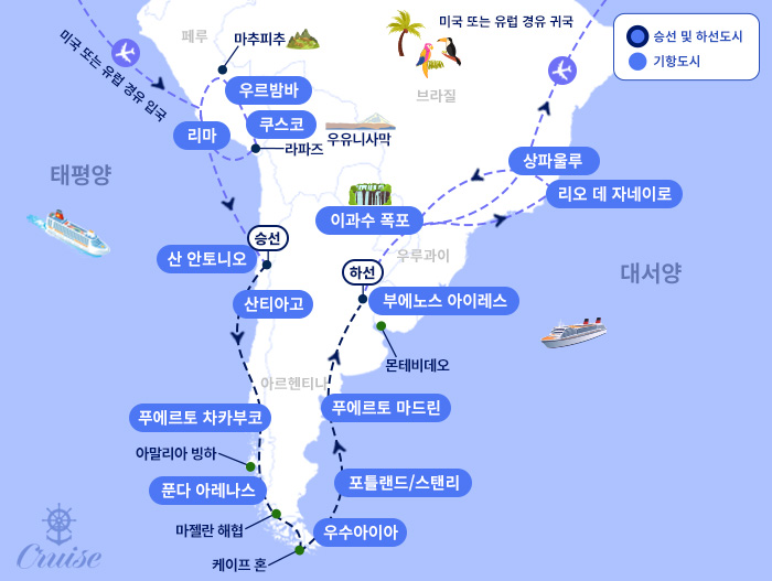 인 천 ▶ 경유도시 ▶ 리마 ▶ 쿠스코 ▶ 마추픽추/우루밤바 ▶ 쿠스코 ▶ 리마 ▶ 라파즈 / 우유니 ▶ 리마 ▶ 산티아고 / 산 안토니오 ▶ 푸에르토 몬트 ▶ 푸에르토 차카부코 ▶ 아말리아 글레이시어 ▶ 푼타 아레나스 ▶ 우수아이아 ▶ 케이프혼 ▶ 포클랜드 / 스탠리 ▶ 푸에르토마드린 ▶ 몬테비데오 ▶ 부에노스 아이레스 ▶ 상파울루 ▶ 이과수/이과주 ▶ 리오 데 자네이로 ▶ 상파울루 ▶ 인 천