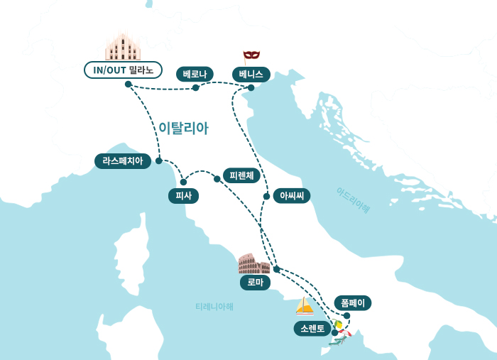 ■ 호텔☑ 전일정 일급 호텔 숙박※ 일정표상 호텔은 예정호텔로 현지 사정에 따라 근교 도시 숙박으로 진행될 수 있습니다.■ 이탈리아 일주 주요 관광지☑ 이탈리아 패션과 경제의 중심지 밀라노☑ 세계문화유산이자 동화같은 해변 마을의 정취를 느낄 수 있는 친퀘테레☑ 르네상스가 처음 꽃핀 도시 피렌체☑ 세계 7대 불가사의 중 하나인 피사의 사탑이 있는 피사☑ 프란체스코 성인의 도시 아씨시☑ 산마르코 광장, 산마르코 성당, 탄식의 다리 등 주요 명소가 있는 물의 도시 베니스☑ 화산재에 묻힌 비운의 도시 폼페이☑ 콜로세움,포로로마노, 트레비 분수까지 상직적인 유적들을 둘러 볼 수 있는 로마☑ 르네상스 예술의 정수를 만끽할 수 있는 바티칸