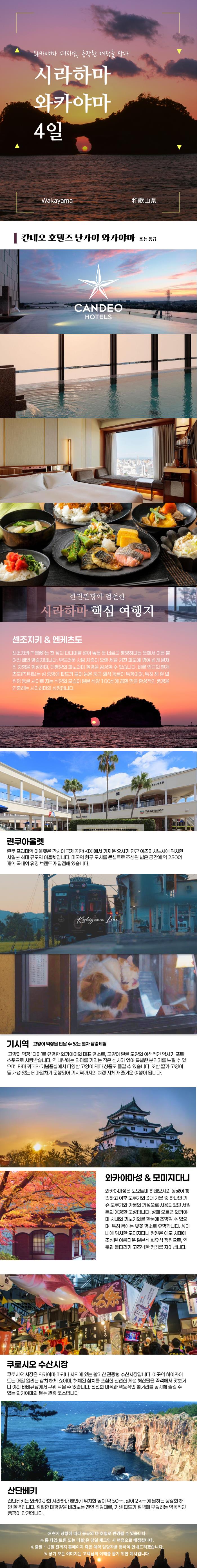 [호 텔] 칸데오 호텔즈 난카이 와카야마(Candeo Hotels Nankai Wakayama) TEL : 073-424-2500확정 호텔은 출발 1일 전까지 홈페이지, 이메일 또는 문자 등을 통해 알려 드리겠습니다. | ||||||||