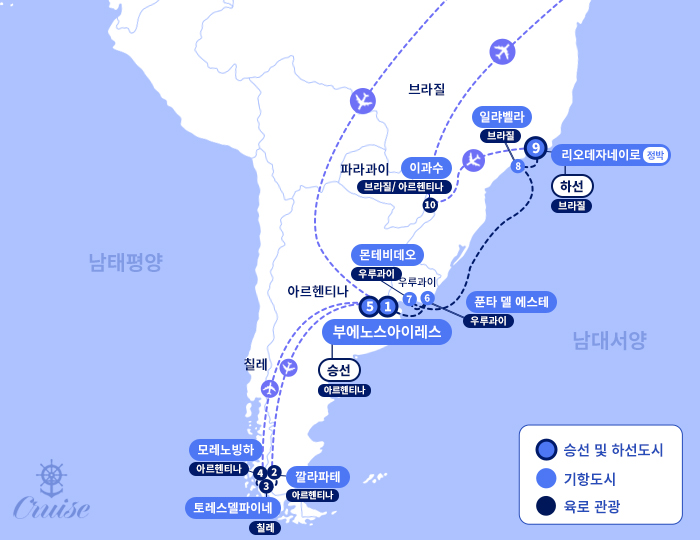 [13:00] 중식 후 크루즈 터미널로 이동 [14:00] 셀러브리티 이쿼녹스호(Celebrity Equinox) 크루즈 승선 [17:00] 부에노스아이레스 출항 | ||||||