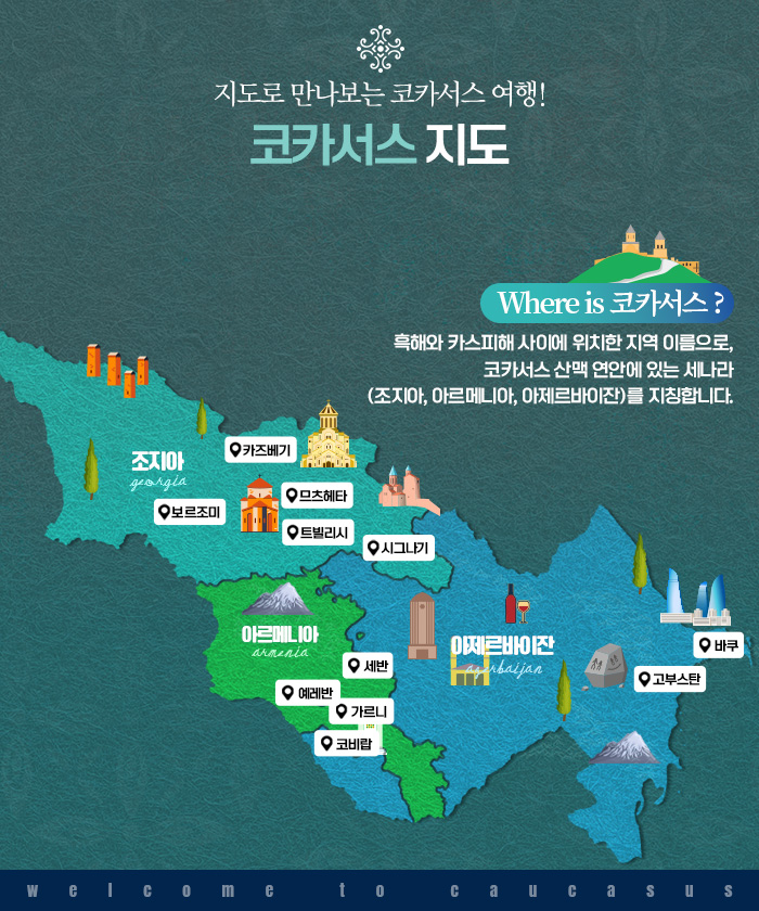 ※ 항공 출도착 시간 및 편명은 미정이며 확정 후 홈페이지, 이메일, 문자 등을 통해 알려 드리겠습니다.■ 한진관광 코카서스 전세기 상품 핵심포인트☑ 바쿠의 랜드마크! 페어몬트 바쿠 플레임 타워(Fairmont Baku, Flame Towers) 숙박 !☑ 가장 빠르고 가깝게 코카서스를 만나다! 코카서스로 떠나는 가장 빠른 항공편! 대한항공 직항 전세기 탑승☑ 아시아와 유럽의 중심 코카서스 산맥 연안의 3개국 코카서스 3개국(조지아, 아제르바이잔, 아르메니아) ☑ 코카서스 3개국의 주요 도시와 필수 관광지로 구성된 상품 !☑ 와인의 본고장 ! 전통방식으로 제조되는 조지아 와이너리 방문 및 와인 시음