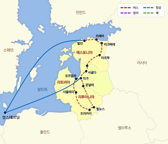 ▶ 상품 핵심 포인트① 발트 3국 5성급 호텔 5박 및 빌뉴스 연박② 엄선된 고급 레스토랑 및 전통 식사 탈린 중세 레스토랑/룬달레 궁전식/5성급 호텔식/각국의 전통식 등③ 발트3국 완벽 일주!, 온전히 발트 3국에만 집중한 여행으로, 유네스코 올드타운 투어와 라헤마 국립공원, 유르말라 해변 등 다채로운 일정④ 노팁/노옵션/노쇼핑 전문투어리더 동행여행에만 집중할 수 있는 올-인클루시브 품격 상품▶ 항공- 프리미엄 국적기 대한항공 '대한항공' 인천 - 암스테르담 직항편 (비즈니스석)- 중간항공 2회 탑승 (암스테르담-탈린, 리가-암스테르담 일반석)- 대한항공으로 발트를 가는 가장 최적의 동선▶ 호텔 : 발트3국 구시가지 5성급 숙박, 연박 포함 일정! ① 발트 3국 수도 탈린, 리가, 빌뉴스 5성급 5박 - 리투아니아 빌뉴스 2박 연박으로 여유로운 숙박▶ 식사 : 발트 전통 요리와 중세풍의 레스토랑 등이 포함된 품격있는 식사 ① 중세도시 탈린 구시가지에서 즐기는 중세풍의 식사② 라트비아의 베르사유, 바로크 풍의 룬달레 궁전 내에 위치한 레스토랑에서의 식사③ 트라카이 고성을 바라보며 즐기는 갈베호수 뷰 레스토랑에서의 품격있는 식사④발트 지역 전통식사 및 호텔식/한식/현지식 등 포함▶ 관광일정 및 특전 : 세 나라의 동화같은 구시가지와 다채로운 문화 유적, 자연관광이 포함된 발트 완전 정복 일주① 비슷하지만 다른 발트 3국 수도의 UNESCO 구시가지 - 13세기 종교적인 중세 고딕 양식들로 발트3국 중 가장 동화같다는 평을 듣는 에스토니아 '탈린' UNESCO 구시가지- 아르누보 건축물들과 여러 건축양식이 혼합된 북유럽의 아르누보 수도 라트비아 '리가' UNESCO 구시가지- 웅장한 바로크 양식의 교회와 붉은 벽돌 건물들이 인상적인 리투아니아 '빌뉴스' UNESCO 구시가지② 에스토니아 주요 일정 - 탈린 구시가지의 여러 문화유산 알렉산더 넵스키 성당 / 키에크 인 더 코크 박물관(내부) / 성 올라프 교회- 에스토니아 북쪽 해안의 자연경관과 문화를를 둘러 볼 수 있는 라헤마 국립공원 / 비루습지 하이킹- 중세 시대 건축물과 생활상을 체험할 수 있는 라크베레성- 2024년 유럽 문화수도로 지정된 문화와 교육의 도시 타르투③ 라트비아 주요일정 - 발트 3국 최대 인구 도시, 리가의 대형 시장과 도심 관광 리가 중앙시장 / 검은 머리 전당 / 성 베드로 교회(내부) 등- 라트비아의 자연과 어우러진 아름다운 성을 볼 수 있는 시굴다 투라이다 성 / 가우야 국립공원 / 구트마니스 동굴- 라트비아의 '베르사유'라고 불리우는 바로크 양식의 룬달레 궁전과 정원- 리가 만을 마주한 긴 해변과 아르누보 스타일의 낭만적인 목조 주택이 있는 라트비아 최대 휴양도시 유르말라 해변 / 요마스 스트리트④ 리투아니아 주요일정 - 역사와 매력이 넘치는 빌뉴스 구시가지와 도심 관광 새벽의 문 / 빌뉴스 대성당 / 게디미나스 언덕 등- 독립과 추모를 위해 10만여개의 십자가로 조성된 신비스러운 샤울라이 십자가 언덕- 아름다운 호수와 붉은 벽돌이 어우러져 낭만적인 분위기를 풍기는 트라카이 성- 트라카이 성과 갈베호수 주변을 360도 감상할 수 있는 갈베호수 요트 탑승 특전!▶ 기타 : 전문투어리더 동행, 전 일정 수신기 대여로 편안한 일정- 경험 많고 숙련된 전문투어리더 동행으로 여행의 편안함을 업그레이드 합니다.- 전 일정 수신기 대여로 여행의 편리성을 제공합니다.- 차량 : 전 일정 30~45인승 이상 대형 버스로 제공됩니다.▶ 유의사항 - 현지 호텔, 식당, 일정은 현지사정에 따라 동급으로 변경될 수 있습니다.- 최소 출발 10인 출발으로 진행됩니다- 항공 미보유 상품입니다. 예약 시 여권상 영문성함까지 확인 해 주시면 항공 예약이 진행됩니다.- 항공 좌석 상황에 따라 요금이 인상될 수 있습니다. 항공 발권 후에는 별도의 취소료가 발생 합니다. (항공권 발권 전 사전 안내)- 유류할증료는 발권일에 따라서 변동될 수 있습니다.